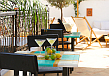 Au centre du riad, le patio s'organise autour d'une piscine élégante, idéal pour se rafraîchir après une journée dans la médina. Les arcades en tadelakt clair, les banquettes habillées de coussins et la végétation apportent une ambiance apaisante, presque suspendue. C'est un lieu de vie à part entière, où l'on prend le petit-déjeuner, où l'on se repose à l'ombre ou simplement où l'on profite du calme rare offert par cette adresse de charme.