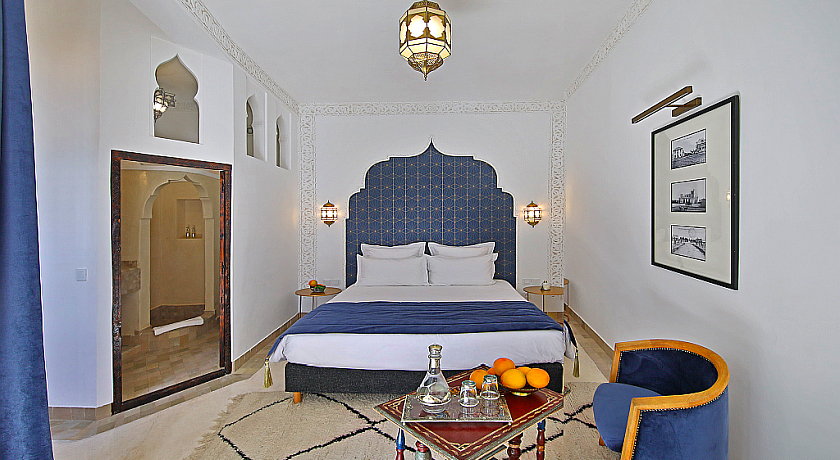 Distribuées autour du patio, les 7 chambres du riad présentent chacune un charme particulier : teintes naturelles, niches décoratives, tadelakt soyeux, éclairages doux et textiles soigneusement choisis. Toutes disposent de leur salle de bains privative, garantissant une intimité totale pour les hôtes, qu'ils soient en famille ou entre amis. L'ensemble peut recevoir jusqu'à 14 personnes (15 max), tout en conservant une sensation d'espace et de confort.