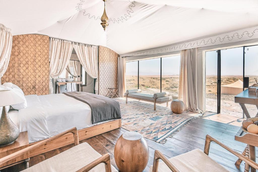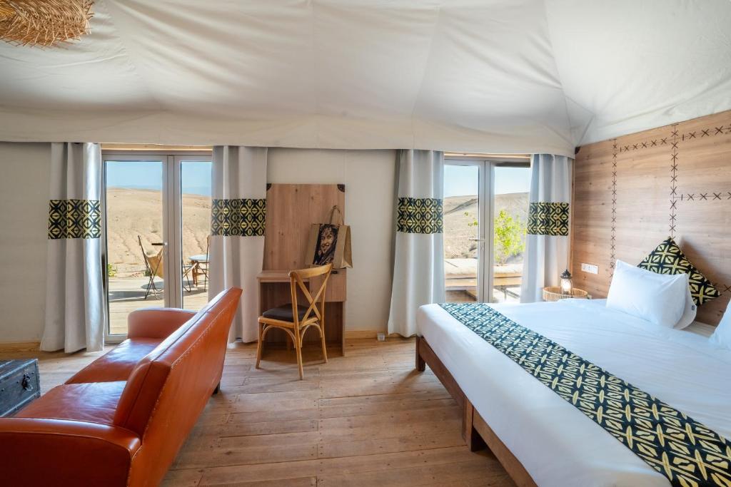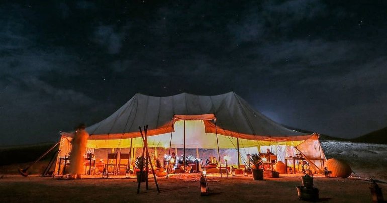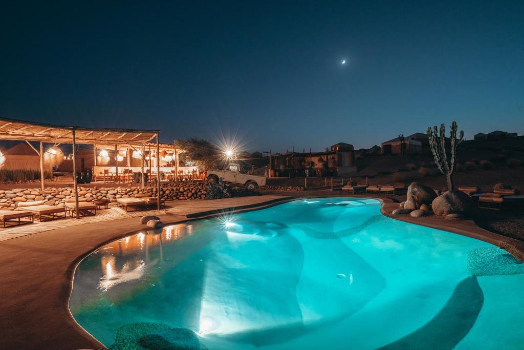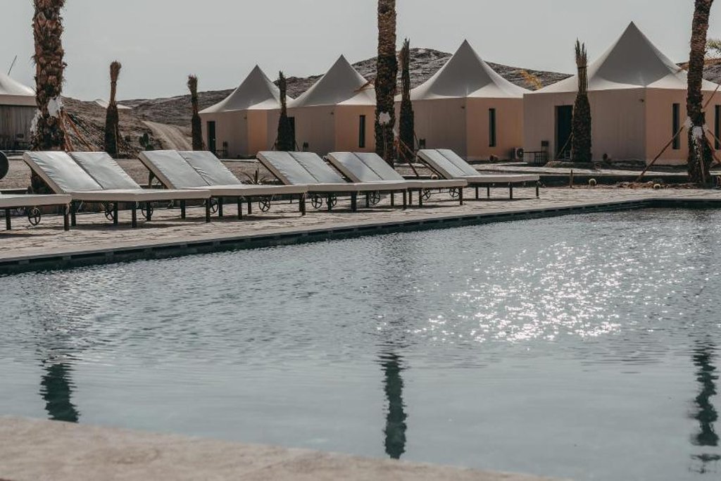 Un concept éco‑lodge où confort contemporain et immersion dans la nature se rencontrent. Le site offre 20 tentes haut de gamme, cuisine Berbère, spa, yoga et expériences culturelles authentiques (cérémonie d’accueil, pain traditionnel, etc.)