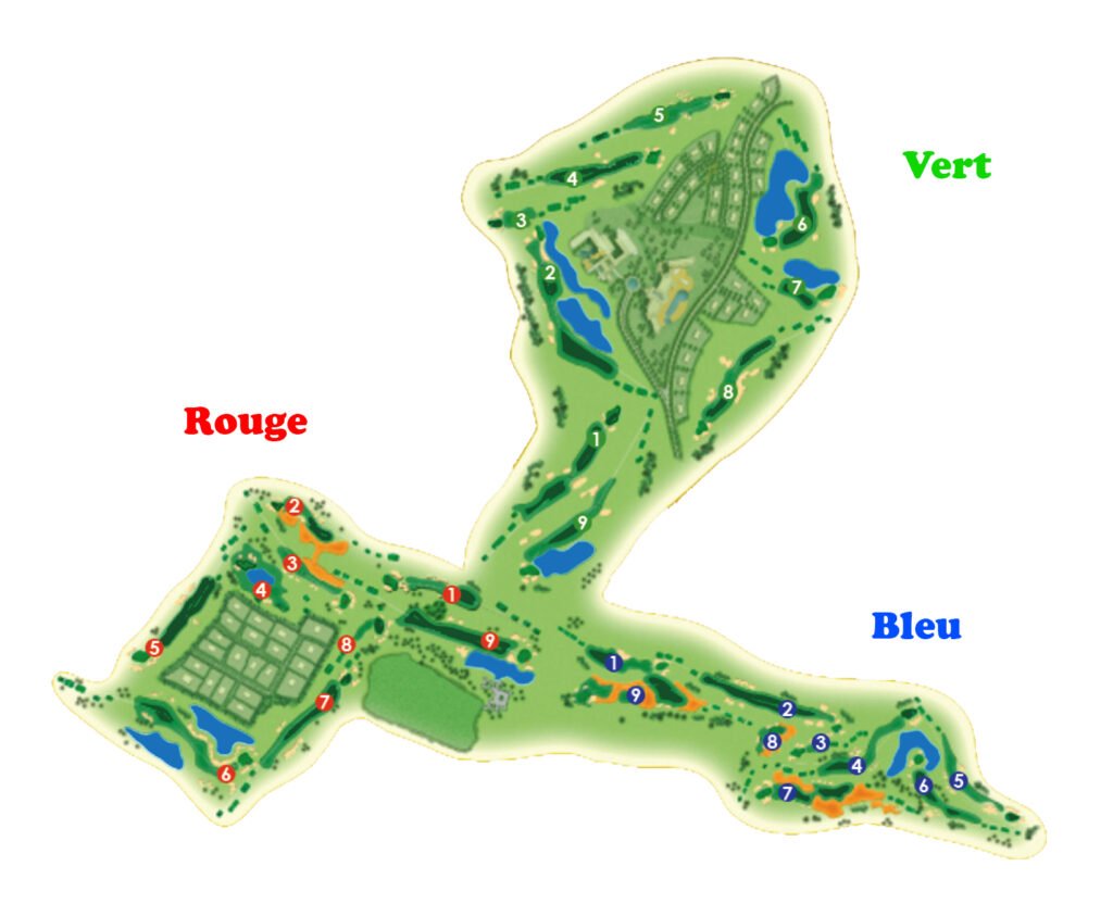 - Le parcours Vert, plus récent, il se révèle aussi joueur qu’exigeant, avec ses dog-legs bien pensés et ses nombreux obstacles d’eau.