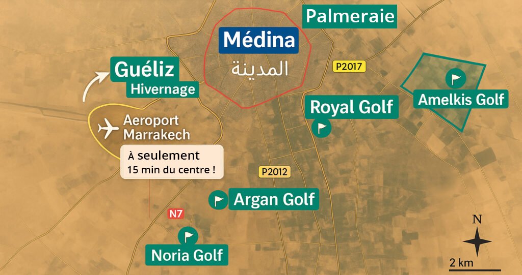 - Vers le nord, la Palmeraie se trouve à environ 12 km, une zone connue pour ses complexes hôteliers et ses résidences de prestige.