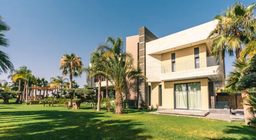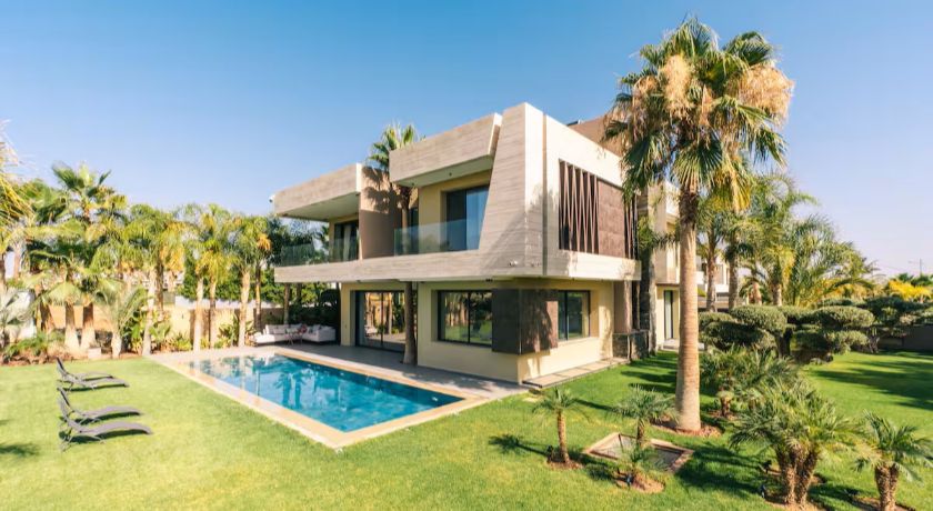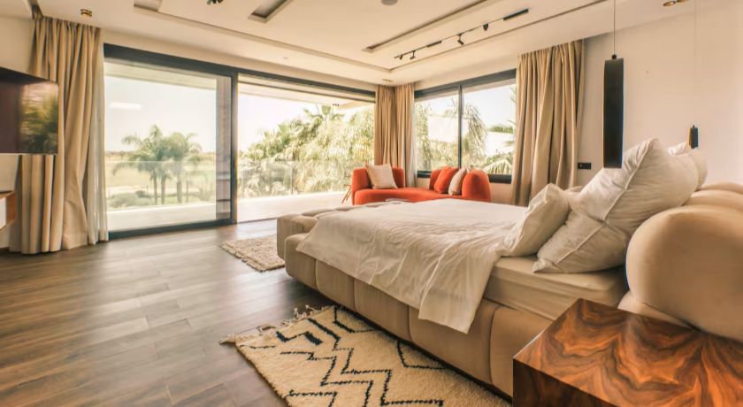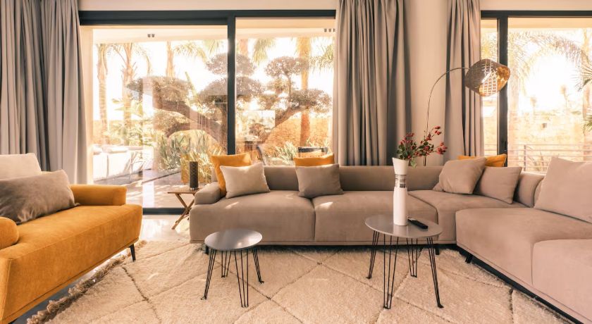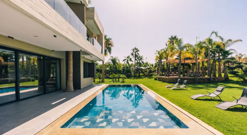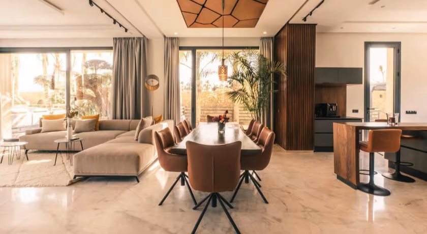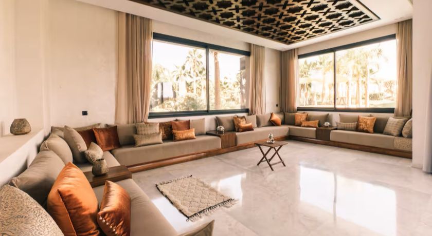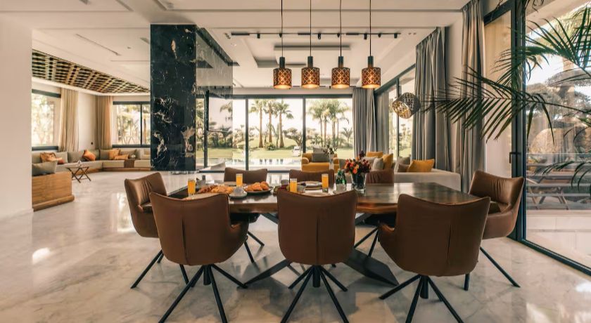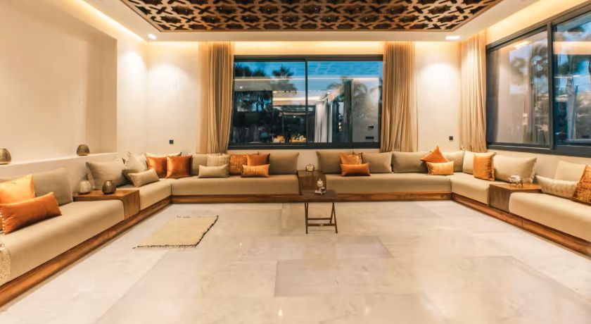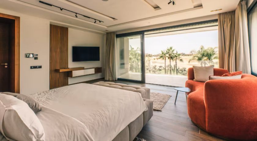 À l'intérieur, la villa révèle de vastes espaces de vie où se répondent un salon européen lumineux et chaleureux, équipé d'une cheminée, et un salon marocain aux lignes traditionnelles, parfait pour un moment de détente en famille. La décoration mêle subtilement œuvres d'art, pièces artisanales et matériaux nobles, créant une ambiance élégante et authentique. Les 5 chambres, toutes dotées de leur salle de bain privée, offrent un confort haut de gamme : lits 180 cm, dressing, climatisation, terrasse ou balcon privatif, parfois même un petit salon pour profiter d'un moment à soi.