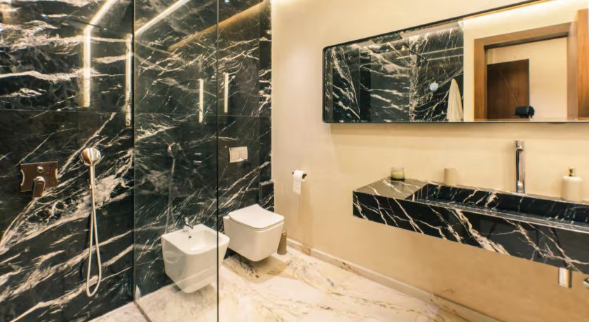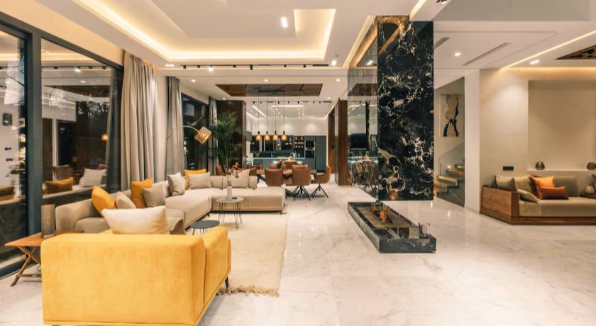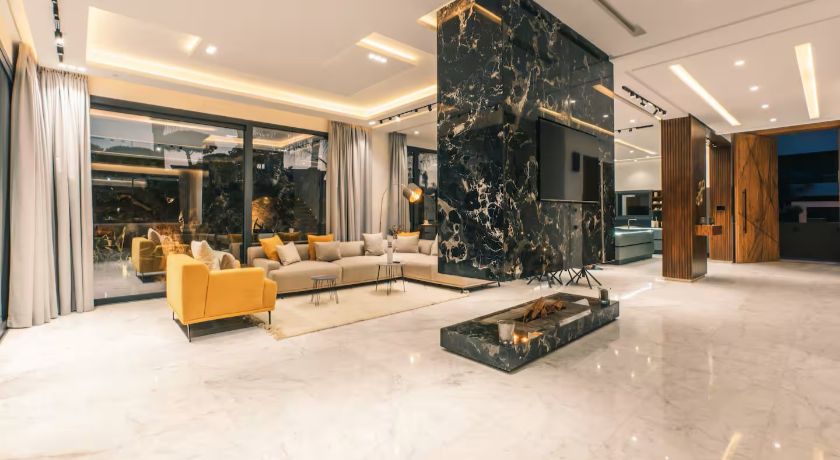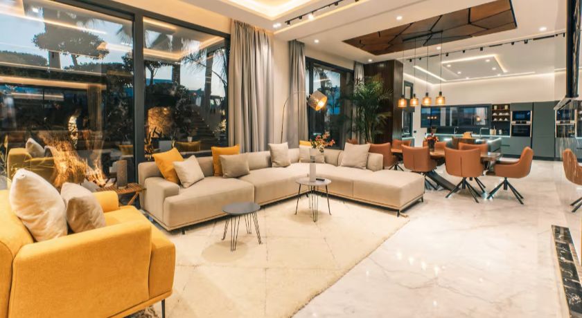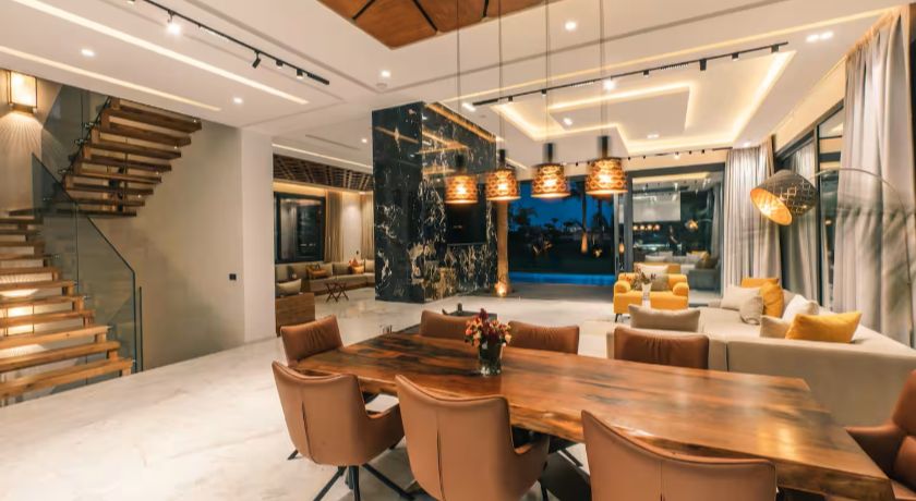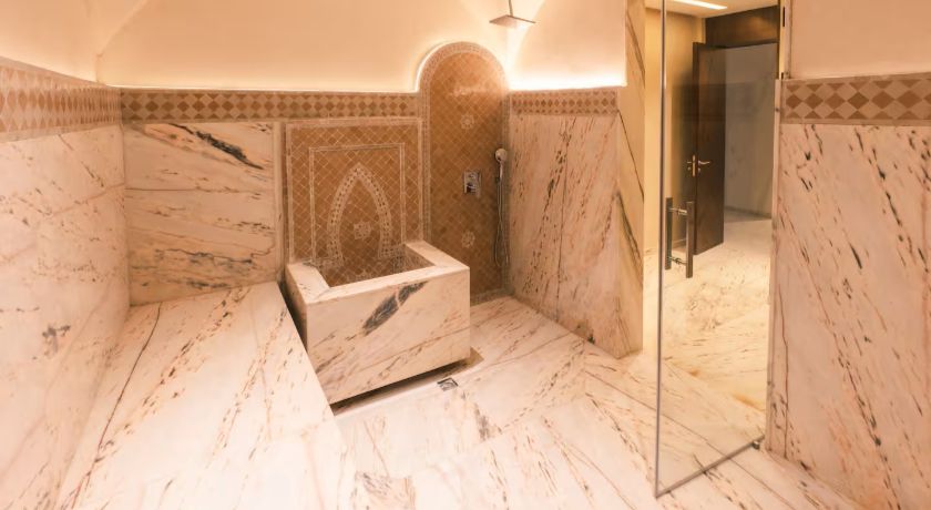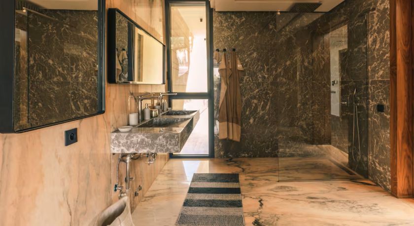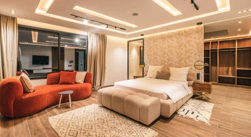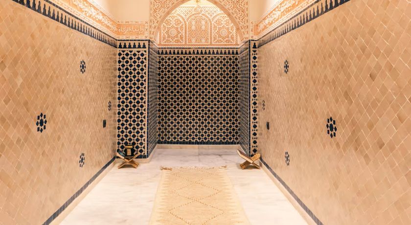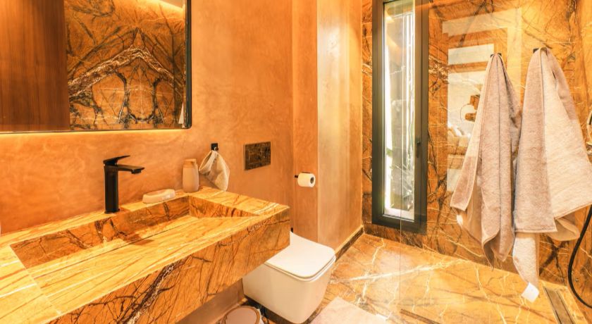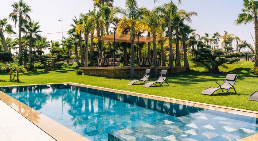 À l'intérieur, la villa révèle de vastes espaces de vie où se répondent un salon européen lumineux et chaleureux, équipé d'une cheminée, et un salon marocain aux lignes traditionnelles, parfait pour un moment de détente en famille. La décoration mêle subtilement œuvres d'art, pièces artisanales et matériaux nobles, créant une ambiance élégante et authentique. Les 5 chambres, toutes dotées de leur salle de bain privée, offrent un confort haut de gamme : lits 180 cm, dressing, climatisation, terrasse ou balcon privatif, parfois même un petit salon pour profiter d'un moment à soi.