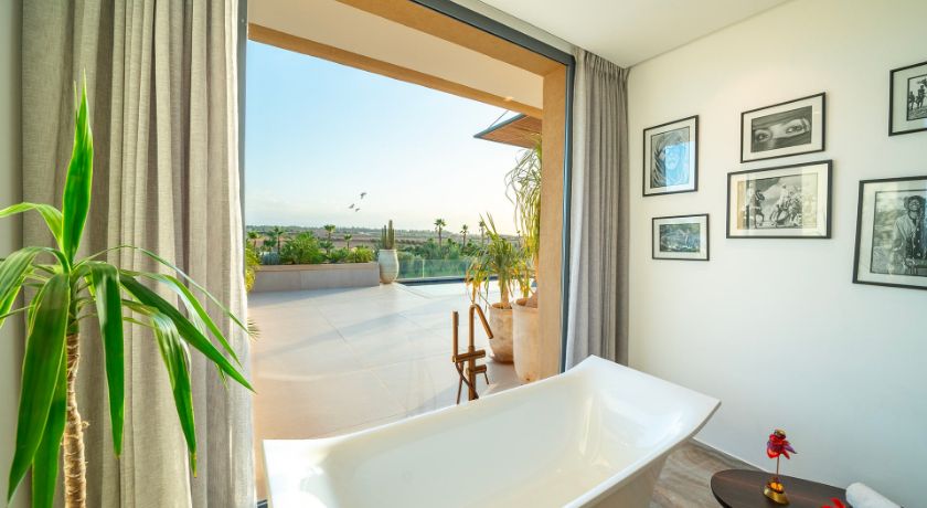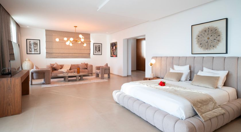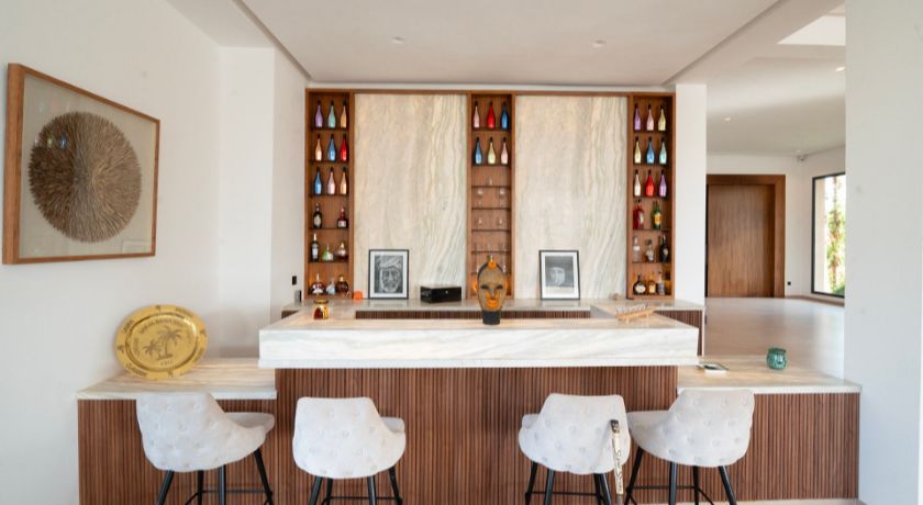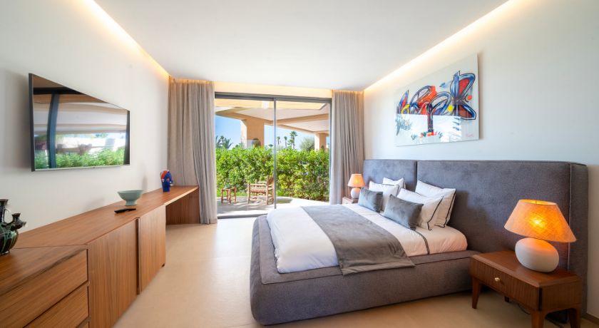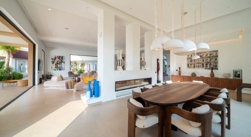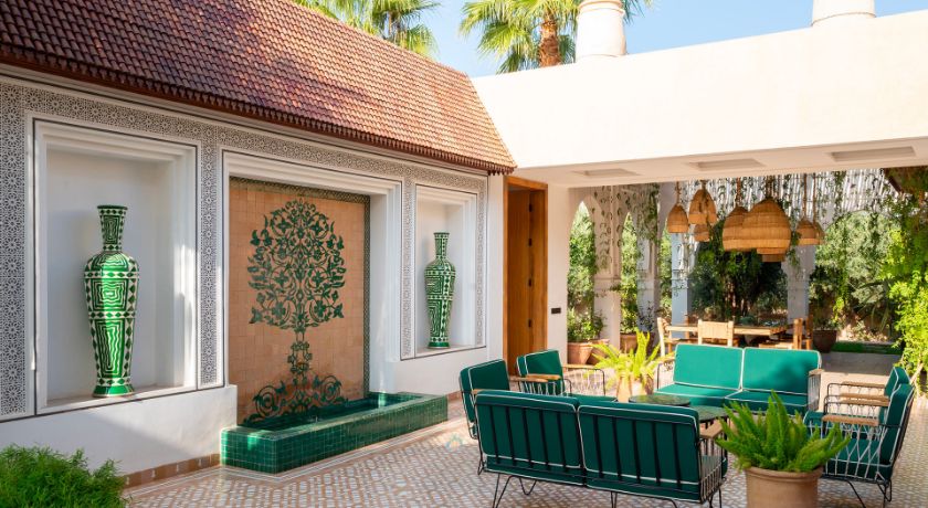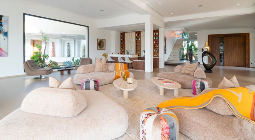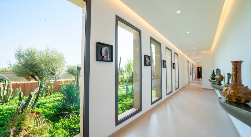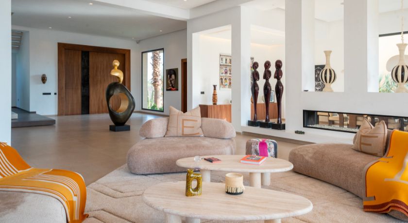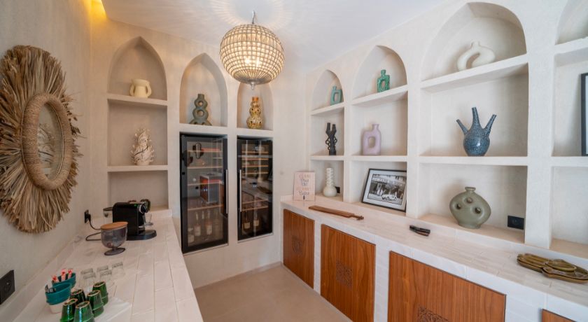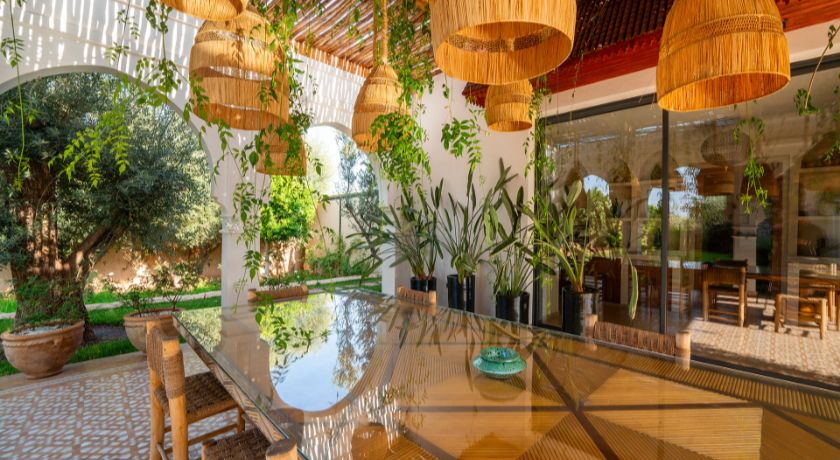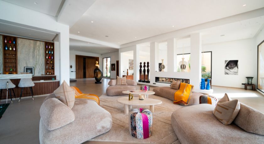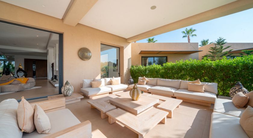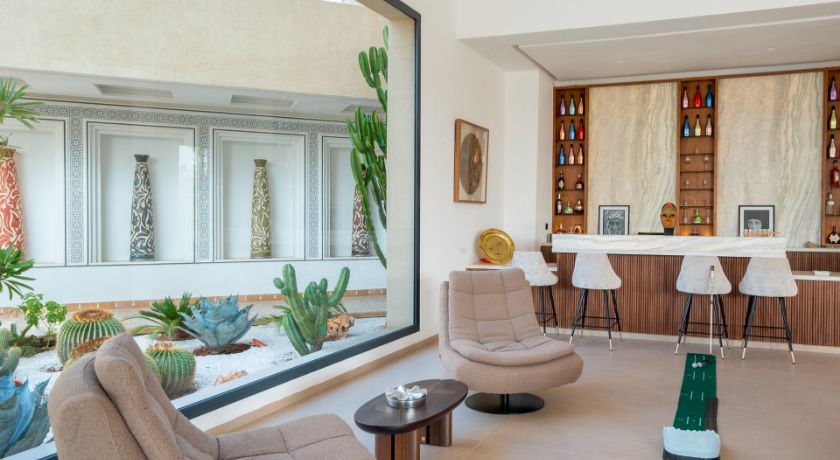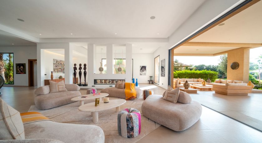 Les intérieurs de la villa sont à la fois spacieux et lumineux, avec des pièces ouvertes sur l'extérieur, décorées avec goût et des éléments typiquement marocains. Le grand salon avec cheminée et bar crée une ambiance chaleureuse et conviviale, tandis que la salle à manger et les différents salons offrent plusieurs options pour se détendre ou recevoir des invités. Chaque coin de la maison a été pensé pour offrir confort et relaxation, faisant de cet espace une véritable maison de famille où l'on se sent chez soi.