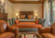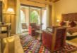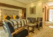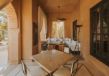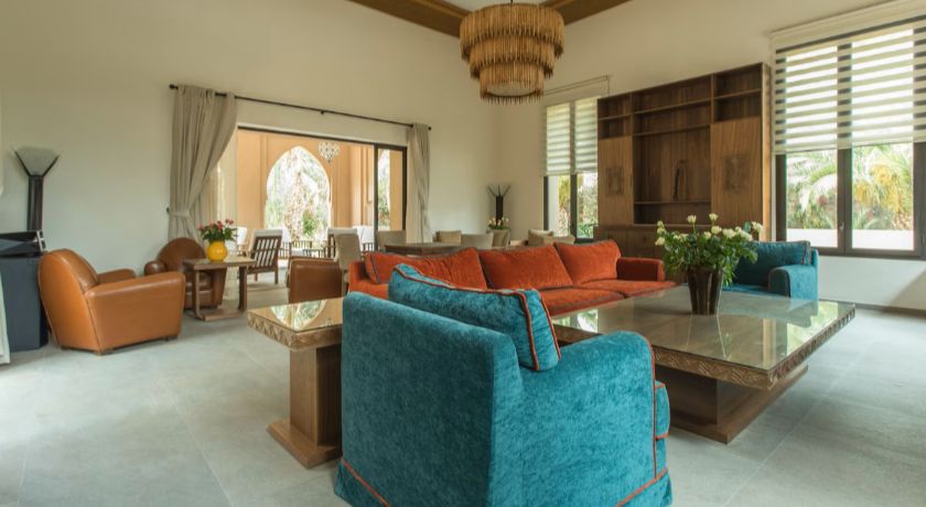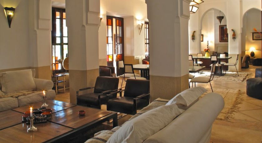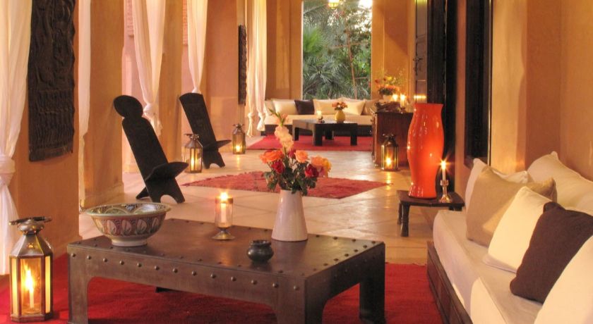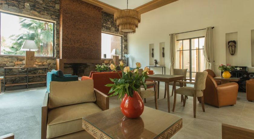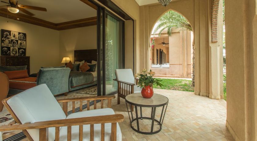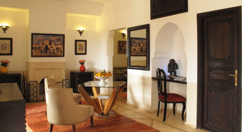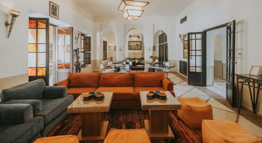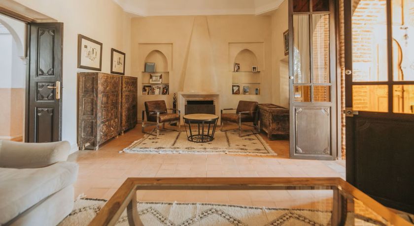 À l'intérieur, la villa déploie une ambiance chaleureuse où l'élégance coloniale rencontre le style marocain. Les meubles d'époque – restaurés et issus de l'ancienne Mamounia – côtoient des pièces contemporaines dans un équilibre raffiné. Le vaste salon, la salle à manger ouverte, le coin bibliothèque ou encore l'espace TV composent un ensemble convivial pensé pour recevoir de grands groupes tout en préservant des zones de tranquillité. Chaque espace a été imaginé pour que tous puissent se retrouver, partager un thé, profiter d'un repas préparé sur place ou simplement se détendre dans une atmosphère raffinée.