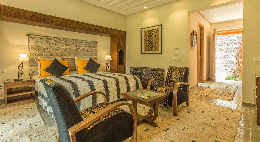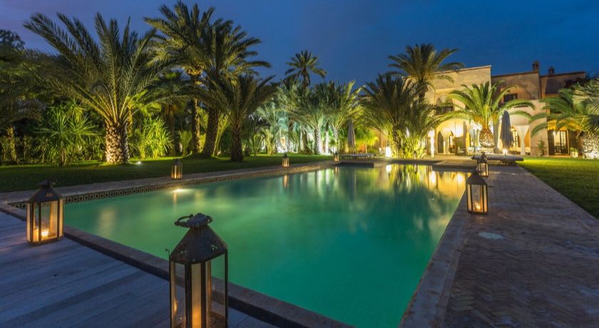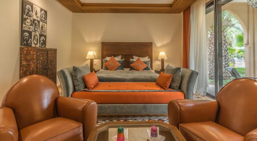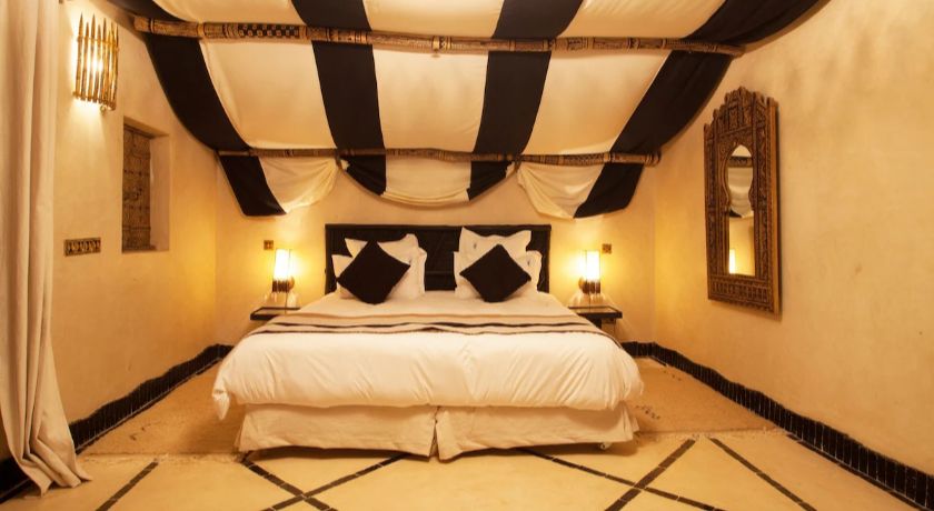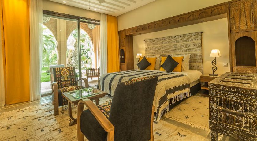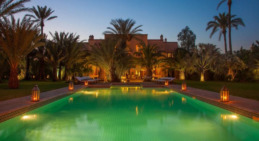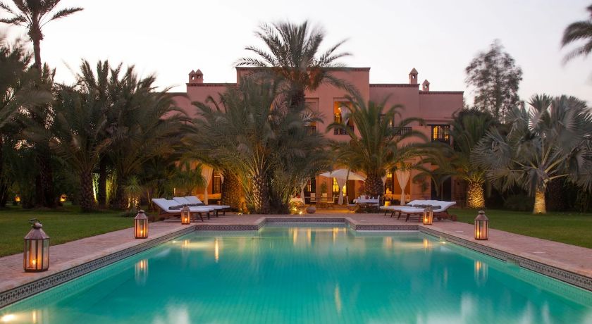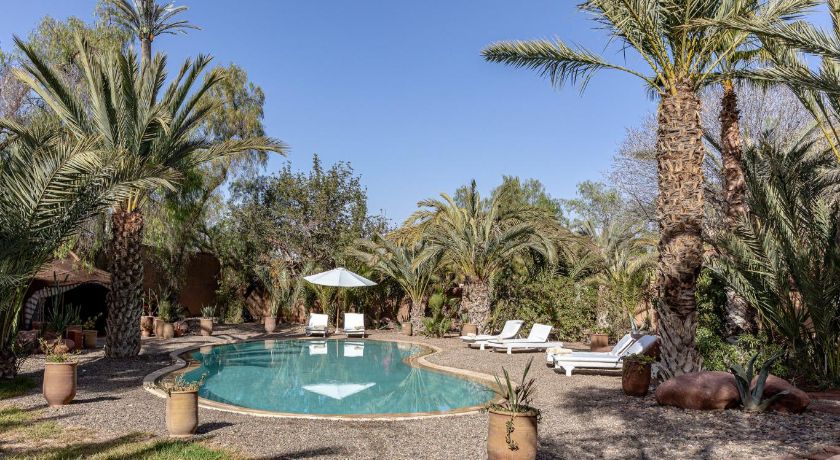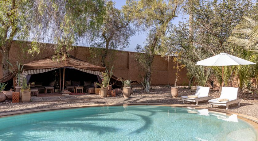 La propriété se compose d'une grande villa de 9 chambres – complétée par 2 lodges indépendants de 4 chambres chacun, permettant d'offrir à chaque hôte un véritable sentiment d'intimité. Certaines chambres disposent d'un accès direct au jardin ou à la piscine, d'autres s'ouvrent sur de belles terrasses en étage, toutes bénéficiant d'un confort moderne : lits king-size, climatisation, salles de bains privatives, cheminées ou salons selon les catégories. Les 4 suites berbères, véritables pavillons au charme unique, apportent une touche dépaysante : habillées comme des tentes traditionnelles à l'extérieur et aménagées avec un luxe feutré, elles créent un petit village intime autour d'une piscine chauffée, notamment magique à la tombée de la nuit.