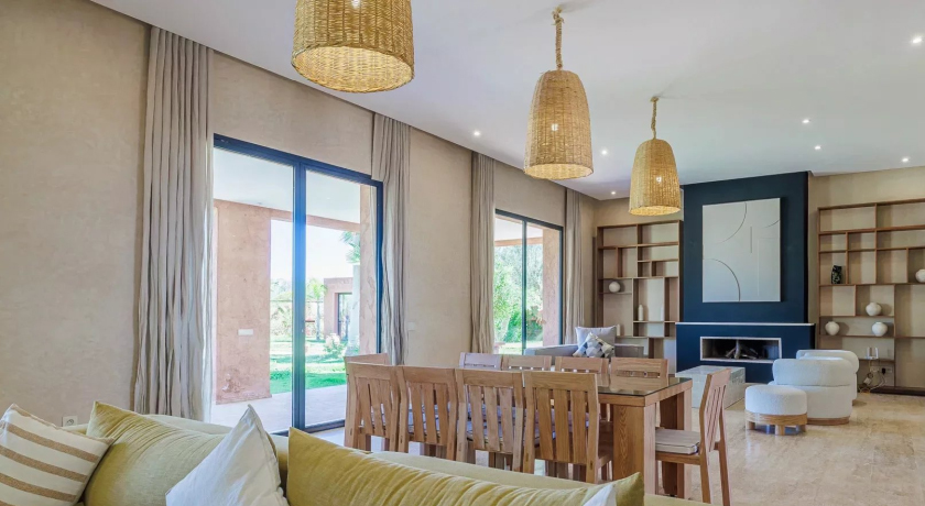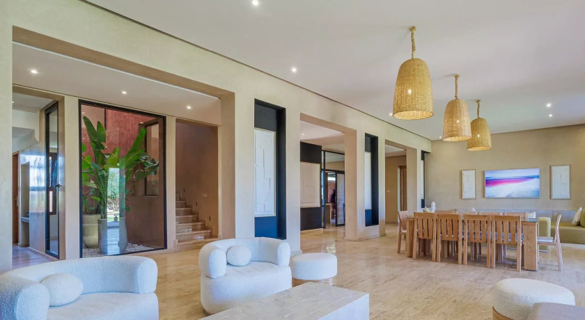 À votre arrivée, vous serez immédiatement séduit par le charme de son architecture et l'agencement de ses espaces. Le salon spacieux, baigné de lumière naturelle, est l'endroit parfait pour se détendre, tandis que la salle à manger, ouverte sur un jardin verdoyant et une piscine scintillante, promet de délicieux moments de convivialité. Chaque détail de la villa a été pensé pour apporter une touche de sophistication à votre séjour, des matériaux de qualité à l'ambiance chaleureuse qui règne dans chaque pièce.