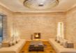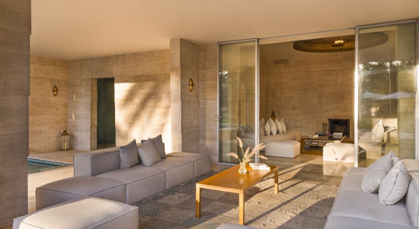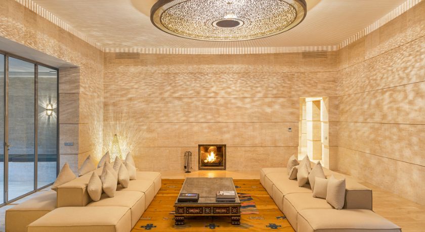 Les espaces intérieurs de la villa sont à la fois spacieux et lumineux, avec des hauts plafonds et de grandes baies vitrées donnant sur les jardins. Le salon principal, décoré avec goût, vous offrira une atmosphère chaleureuse, surtout pendant l'hiver grâce à la cheminée centrale. La salle à manger, dotée d'une grande table en marbre, est idéale pour partager des repas conviviaux. Les amateurs de cinéma et de bien-être apprécieront également la salle de cinéma privée et le spa avec hammam et sauna, où il est possible de profiter de massages et autres soins sur demande.