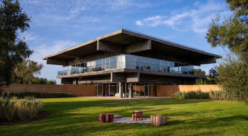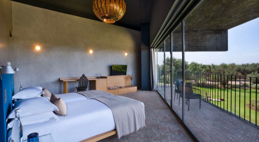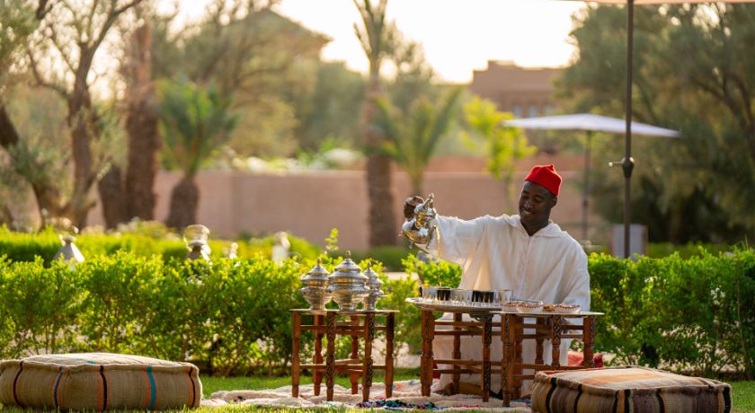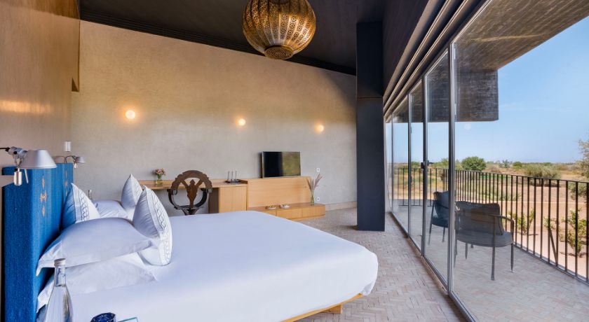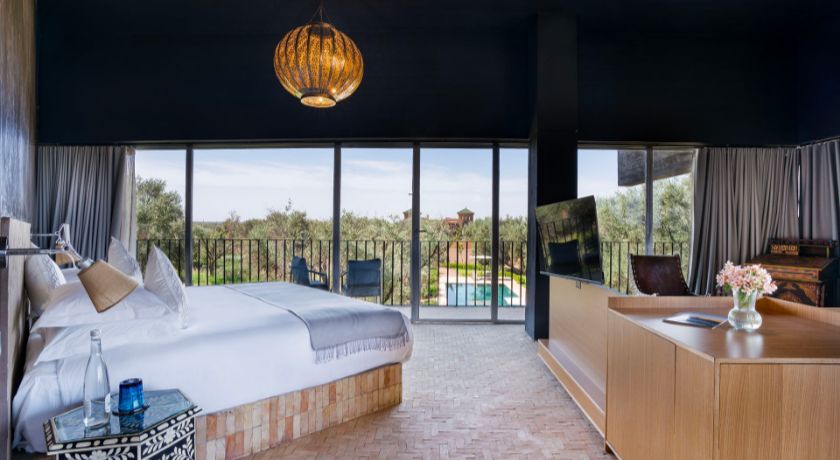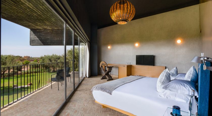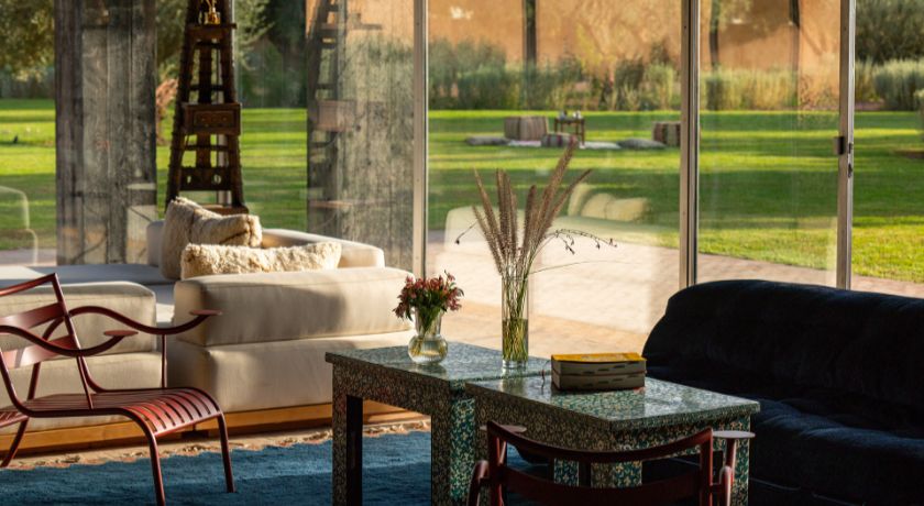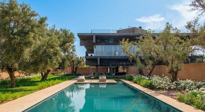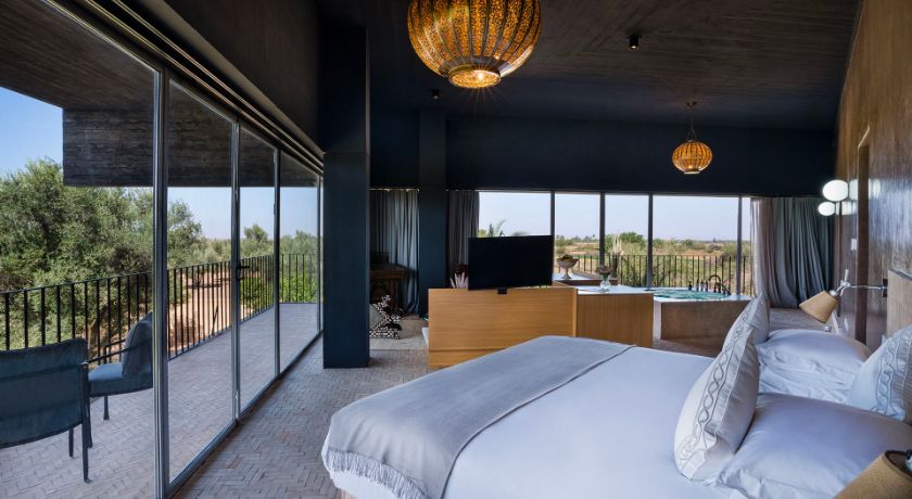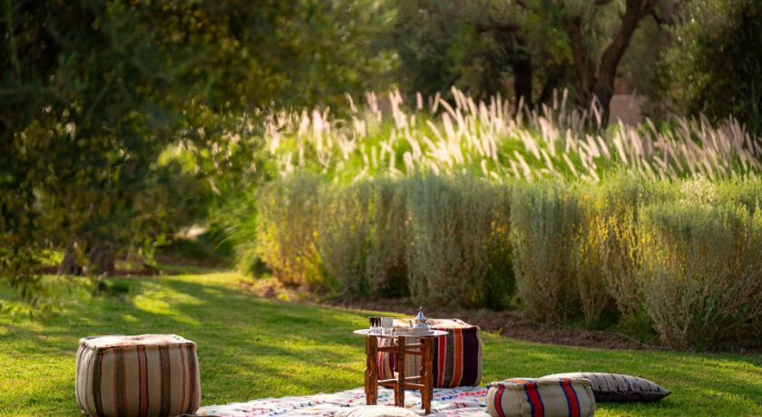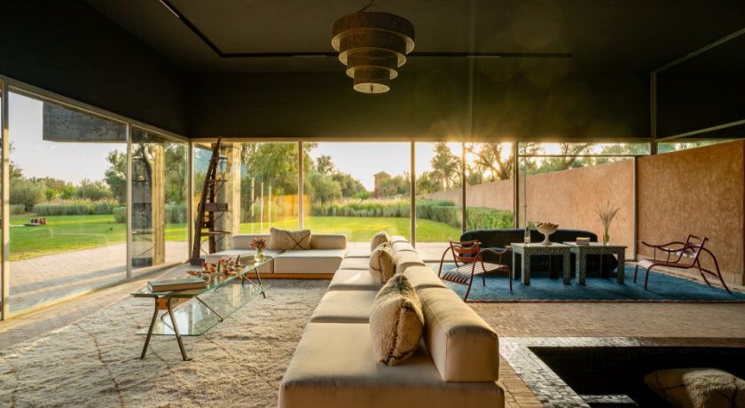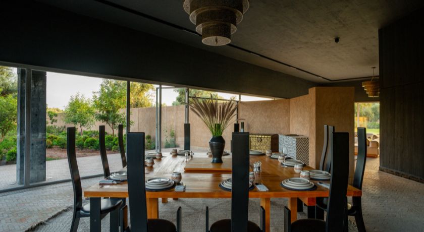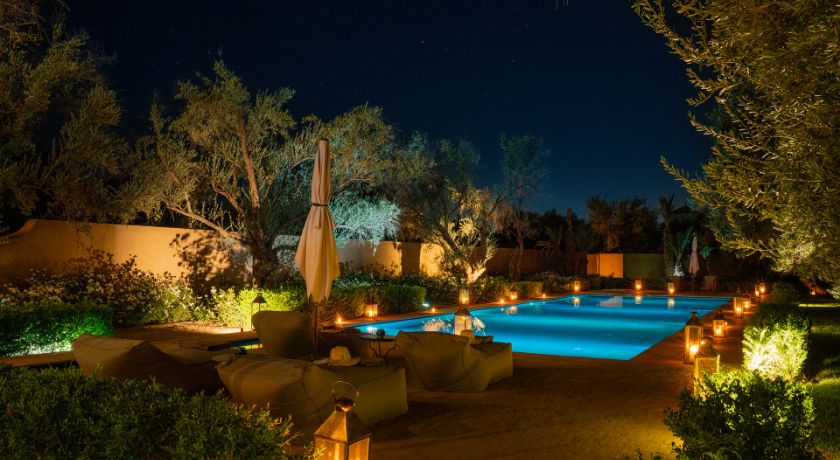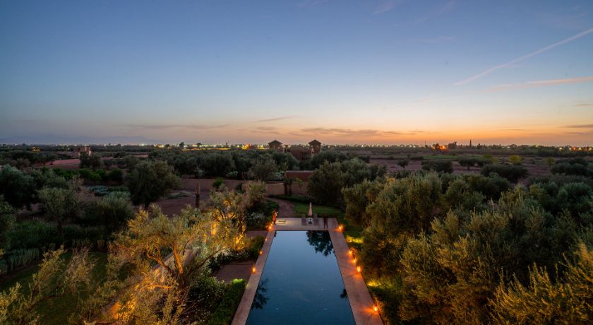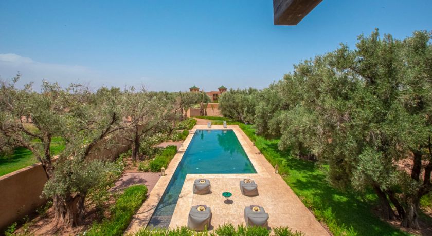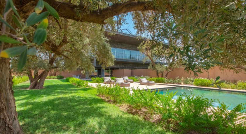 À l'extérieur, les jardins de la villa se divisent en quatre espaces distincts, chacun ayant son propre caractère : la forêt sauvage, l'oliveraie, le jardin andalou et le verger. L'immense terrasse avec vue sur la piscine de 130 m² est un lieu idéal pour vos repas conviviaux ou pour se détendre sous le soleil de Marrakech. Que ce soit pour un barbecue en famille ou un moment de relaxation, l'espace extérieur est conçu pour répondre à toutes vos envies.