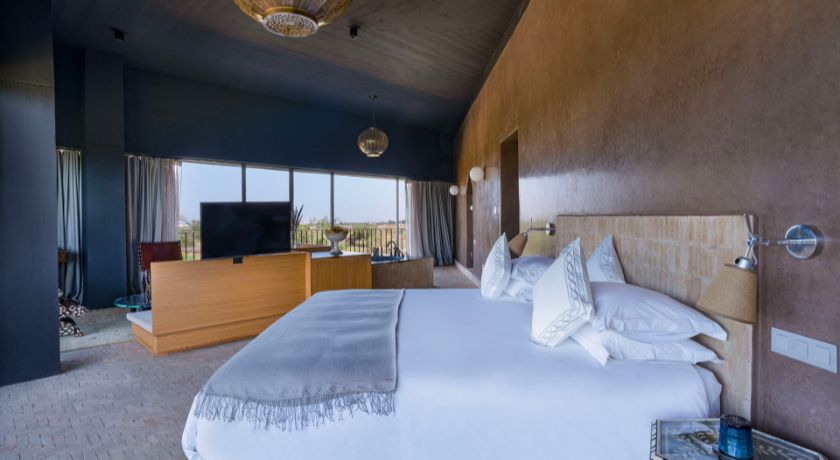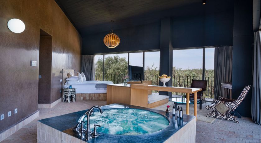 L'intérieur de la villa a été pensé pour offrir une expérience unique. Chaque chambre est un véritable cocon, avec des lits king-size et des salles de bain privatives. L'espace bien-être, composé d'un hammam, d'un jacuzzi et d'une cabine de soin, vous invite à la relaxation totale. La villa dispose également d'une salle de sport entièrement équipée et d'un home cinéma pour vos soirées en famille ou entre amis. La décoration, mêlant le Tadelakt et les zelliges, confère une ambiance chaleureuse et sophistiquée, avec des touches d'art et de mobilier marocain authentique.