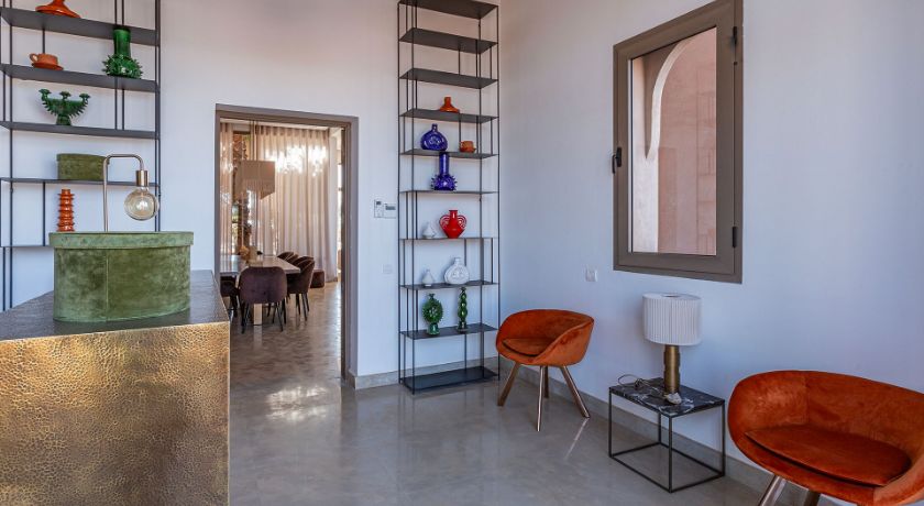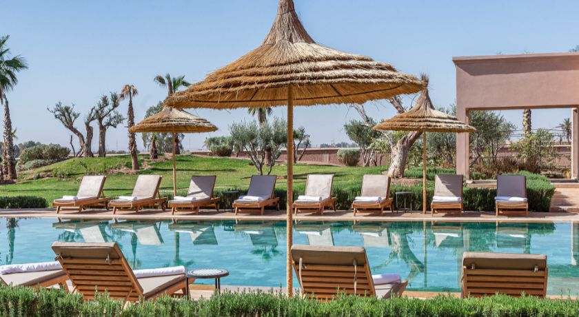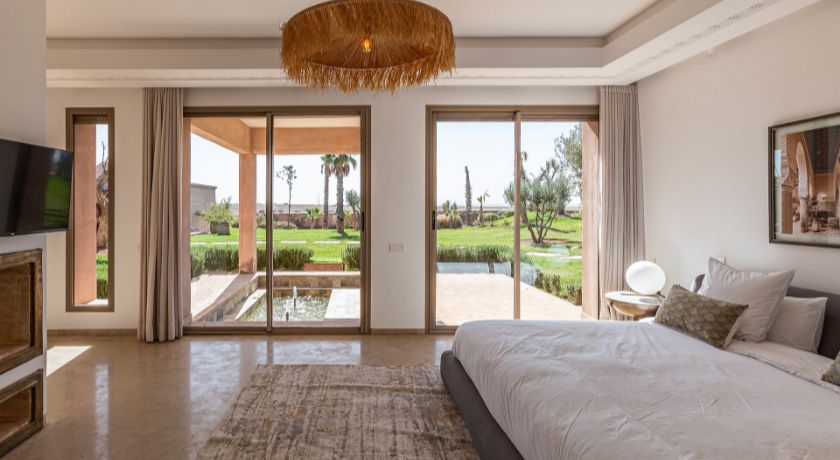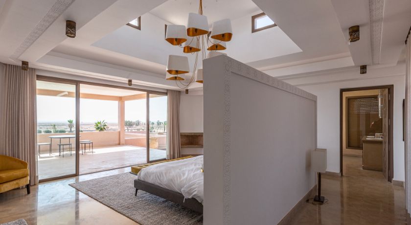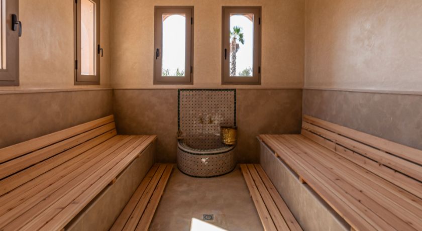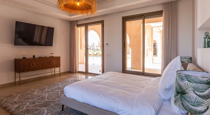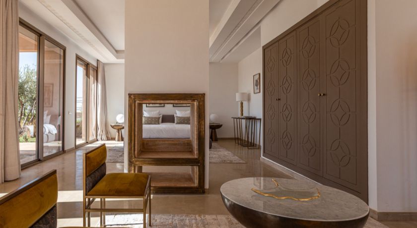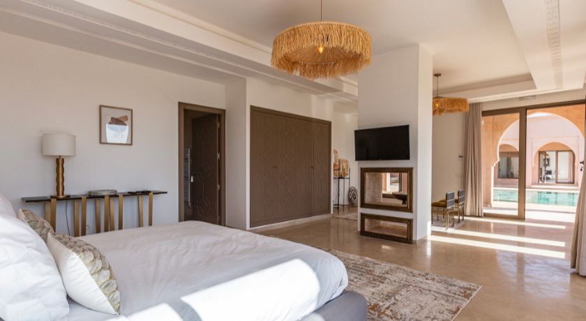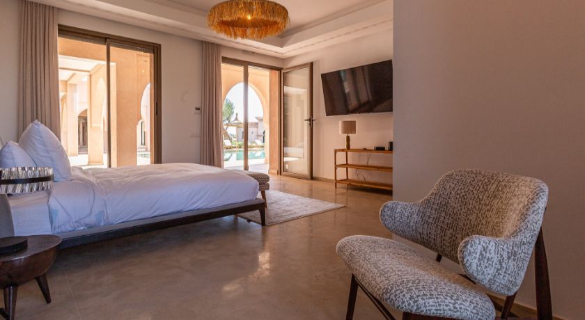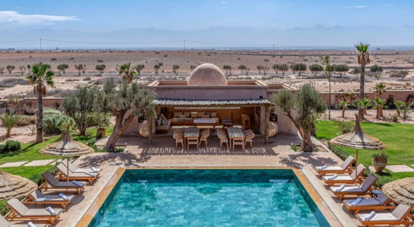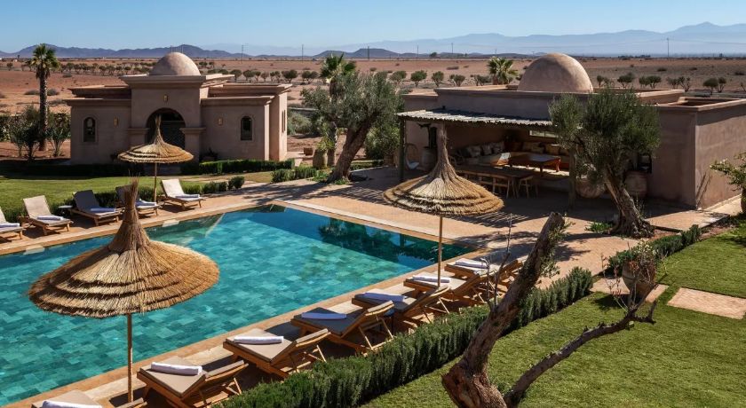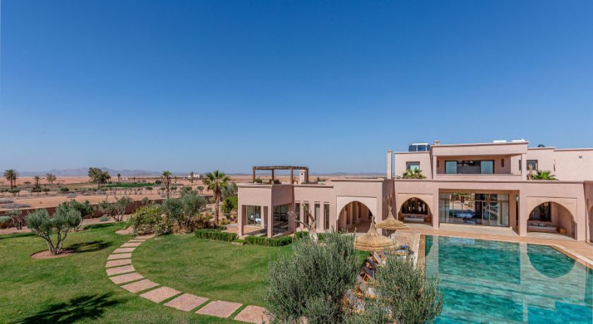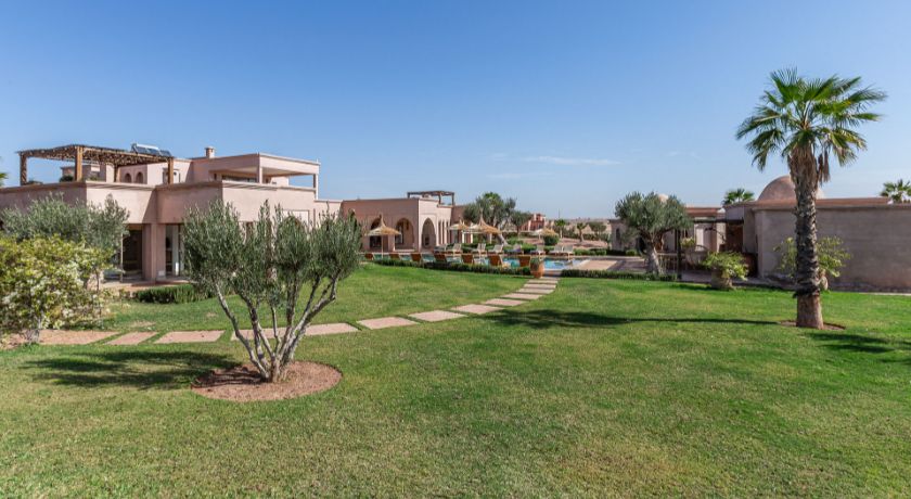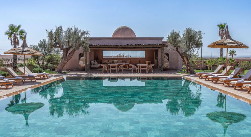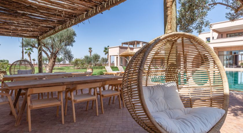 À l'extérieur, tout est réuni pour profiter pleinement du climat de Marrakech. Le jardin paysagé, ponctué d'oliviers et d'arbres fruitiers, entoure une grande piscine pouvant être chauffée, bordée de transats propices au repos. Le pool house, avec son salon et son espace repas, devient un lieu central pour les journées ensoleillées et les soirées conviviales. Un espace bien-être avec hammam et salle de massage vient parfaire l'expérience, invitant à une parenthèse de relaxation absolue.